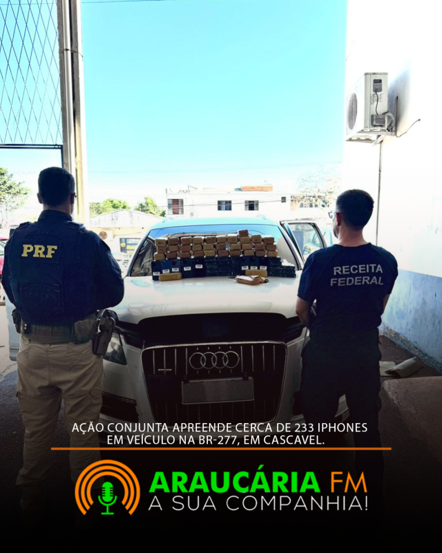 Em ação integrada entre a Polícia Rodoviária Federal (PRF), a Receita Federal e a Polícia Militar (Base Aérea), realizada na manhã desta segunda-feira, 26 de janeiro, por volta das 8h, uma abordagem resultou na apreensão de aproximadamente 233 aparelhos celulares na BR-277, em Cascavel (PR).